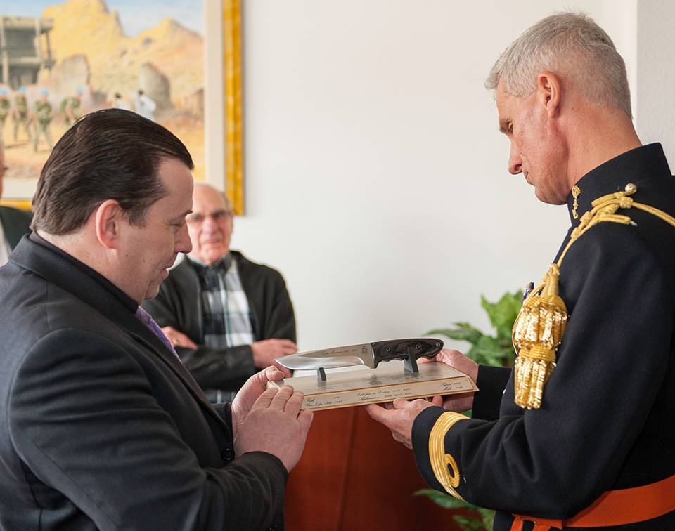 Ter gelegenheid van het jubilerende Korps Mariniers nam BRIGGENMARNS Richard Oppelaar een bijzonder presentje in ontvangst. Op de Van Ghentkazerne kreeg de korpscommandant een gevechtsmes met inscriptie uitgereikt. Dat werd vervaardigd door de bekende Nederlandse messenmaker Albert van den Heuvel. Van den Heuvel, eigenaar van de firma Hill Knives, besloot een ‘mariniersmes’ te vervaardigen naar aanleiding van het 350-jarig bestaan van het korps én vanwege de band die de mariniers hebben met de stad Rotterdam. Het volledig met de hand vervaardigde gevechtsmes bestaat uit een lemmet van gehard roestvaststaal en een handvat van ijzerhout.
