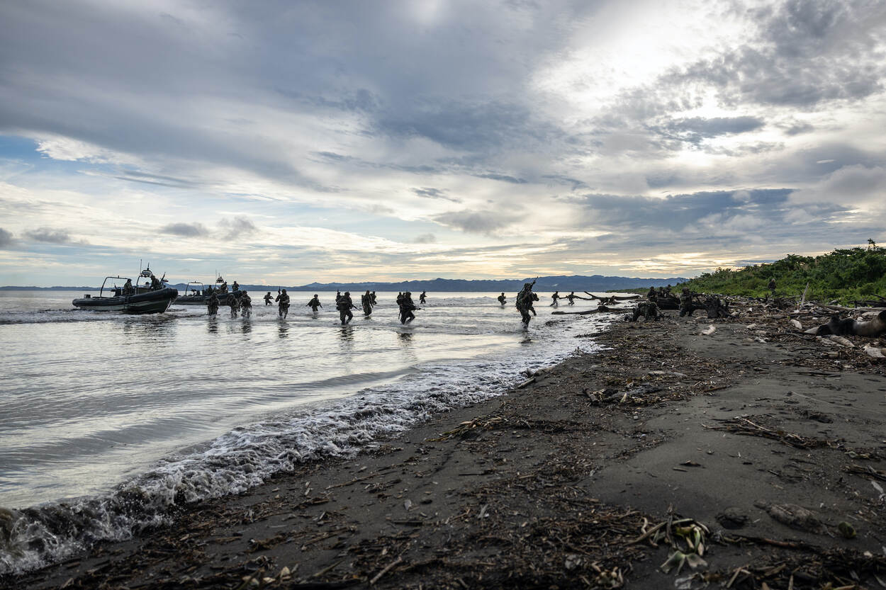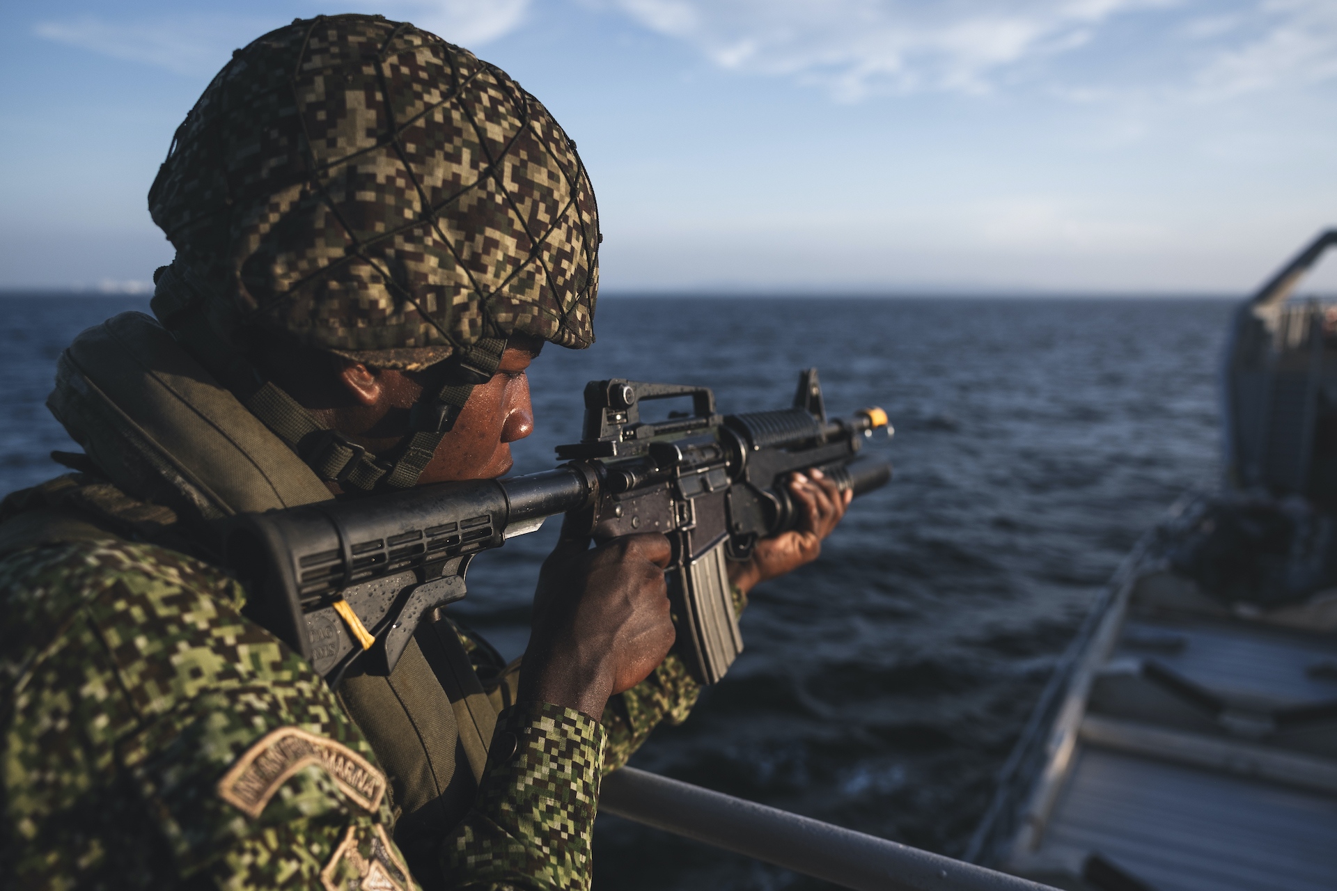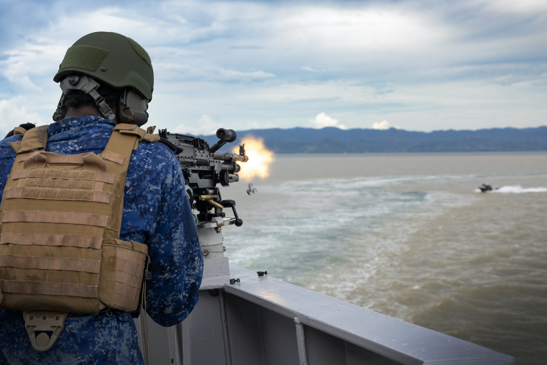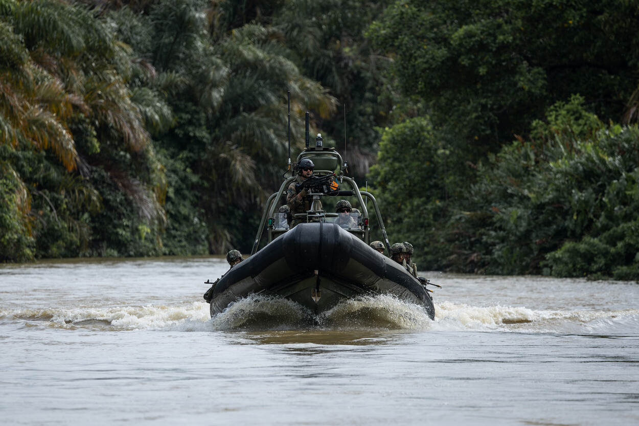 Tijdens Estribo draaide het dan ook niet alleen om mariniers. Ook het ondersteuningsschip Zr.Ms. Pelikaan leverde een belangrijke bijdrage. Zo was er tijdens de oefening een PASSEX op open zee met het Colombiaanse fregat ARC Independiente. Verder zorgde de ‘Peli’ natuurlijk voor transport en logistieke ondersteuning. Maar het ging verder dan die traditionele rol. “In het kader van hoofdtaak 1 wilde ik ook mijn bemanning trainen op gereedheid”, zegt commandant luitenant ter zee 1 Max Borsboom. “Het schip heeft niet veel bewapening, slechts 4 MAG-machinegeweren, en geen sensoren om dreiging waar te nemen. Het gaat echter om de mindset van de bemanning. Die moet zowel in vredestijd als oorlogstijd goed kunnen werken.”