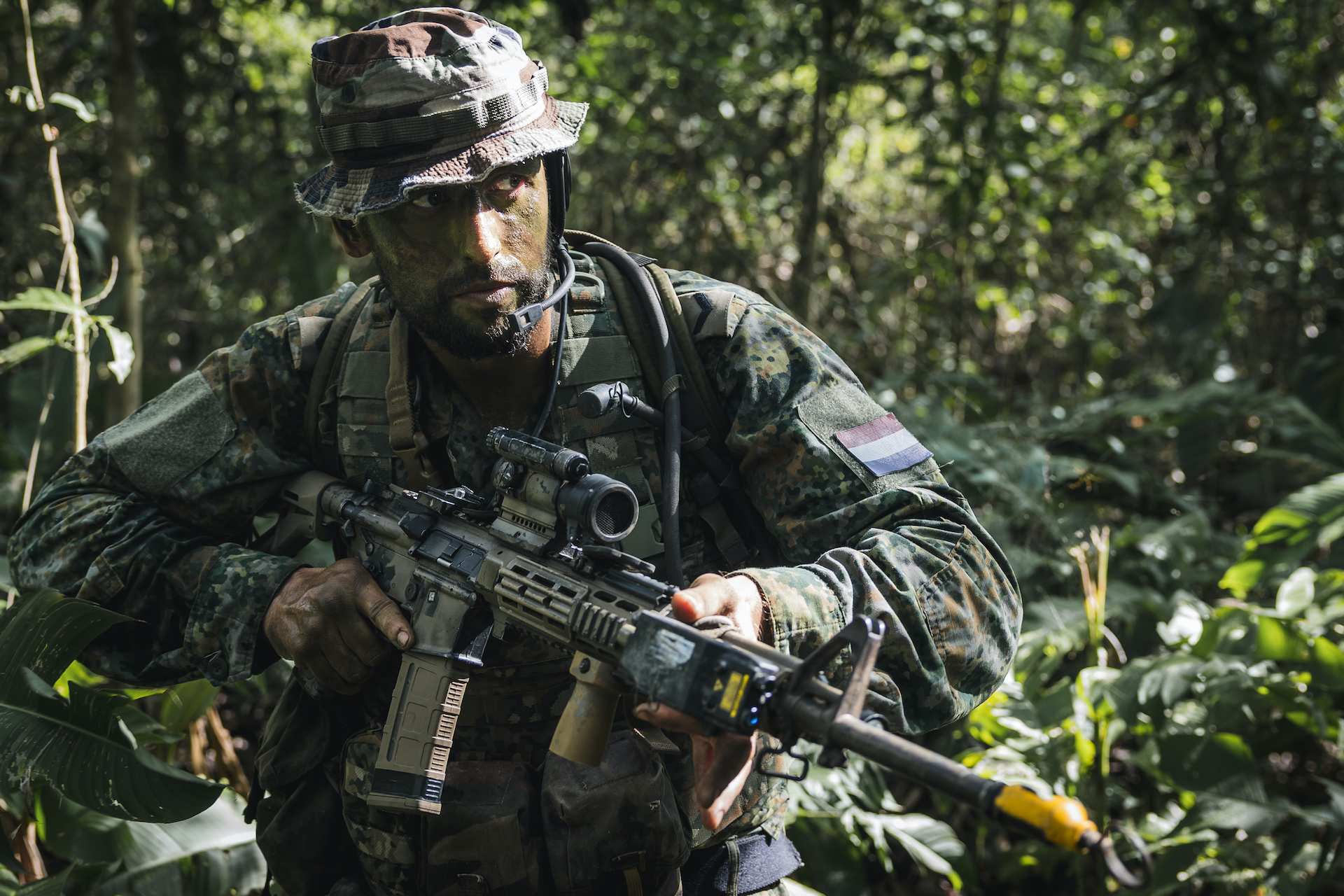Marinier-1 Alper en zijn collega’s waren enthousiast toen ze hoorden dat ze in Colombia gingen oefenen. “Zeker omdat we als eerste ‘cluppie’ hier aan de slag mogen.” Het terrein is hier anders, stelt Alper. De grond is drassig, meer moerasachtig. “Als ik ga staan, zak ik tot mijn knieën weg. In deze omgeving ga je gegarandeerd nat worden, net als tijdens een jungletraining.”