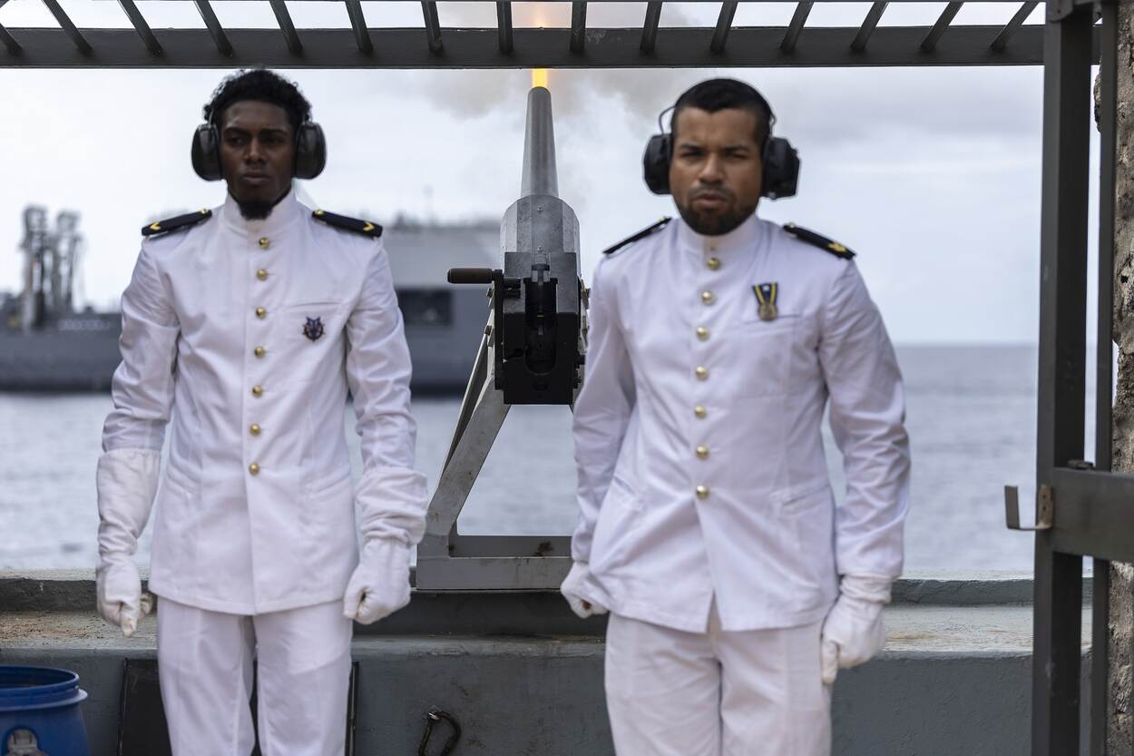 De bouwvakkers die aan het werk zijn in Willemstad, Curaçao, kijken verschrikt op van de luide knallen. Ze pakken hun telefoons en filmen het grote schip dat langs de kust van het eiland vaart. De gloednieuwe Zr.Ms. Den Helder wordt ontvangen en kondigt haar komst aan met 21 saluutschoten. Vanaf het eiland worden evenzoveel saluutschoten teruggevuurd.