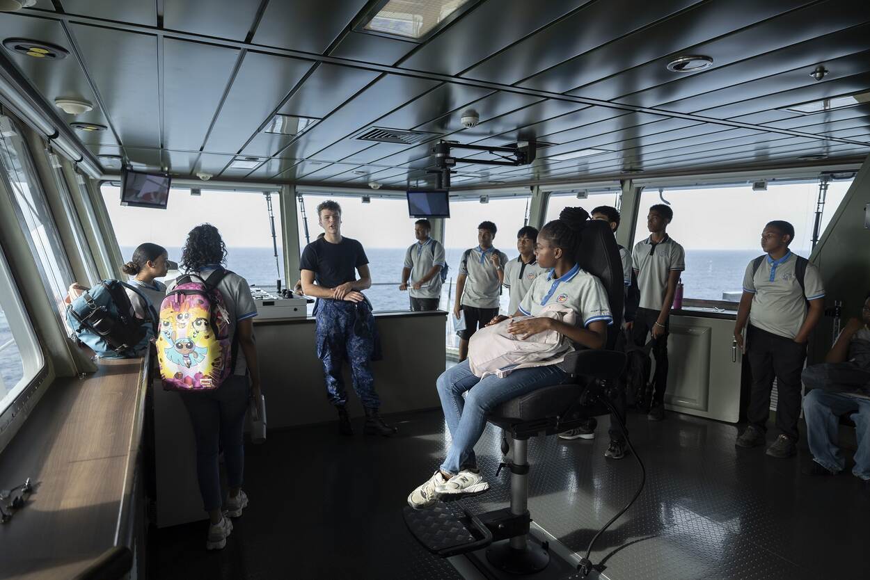 Woensdag 22 oktober opende de Den Helder haar deuren voor de schooljeugd van het eiland. Leerlingen van het Dr. Albert Schweitzer College werden in kleine groepjes rondgeleid en de bemanning van het schip toonde trots de nieuwste aanwinst. Op verschillende dekken keken de studenten hun ogen uit. Letterlijk en figuurlijk hoogtepunt was de brug, waar op ‘de stoel van de kapitein’ selfies gemaakt werden. “Kom alleen niet aan de knoppen, we willen niet per ongeluk wegvaren”, zegt een bemanningslid met een knipoog. De nieuwigheid straalt nog in alles van het schip af, dat viel de leerlingen ook op.