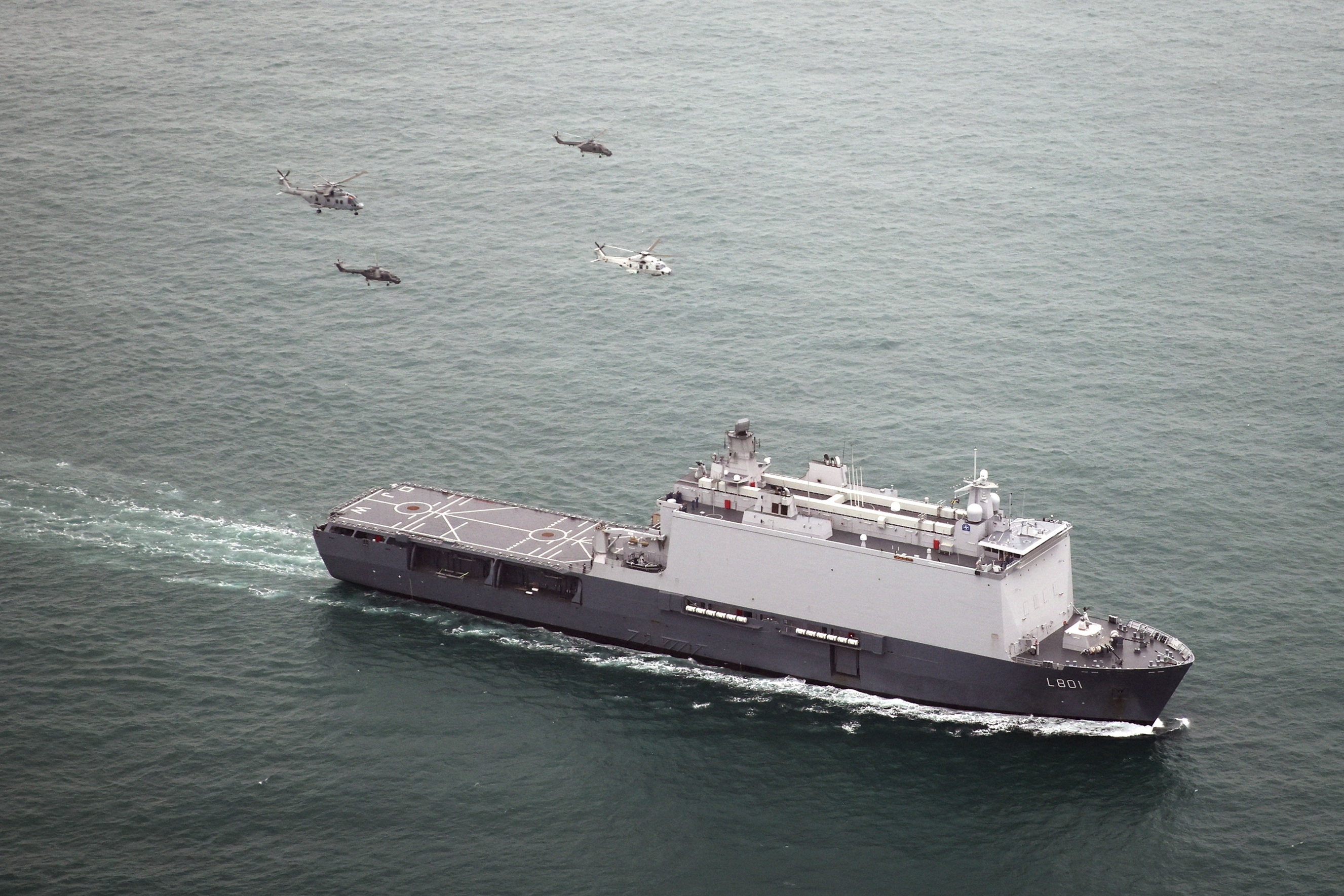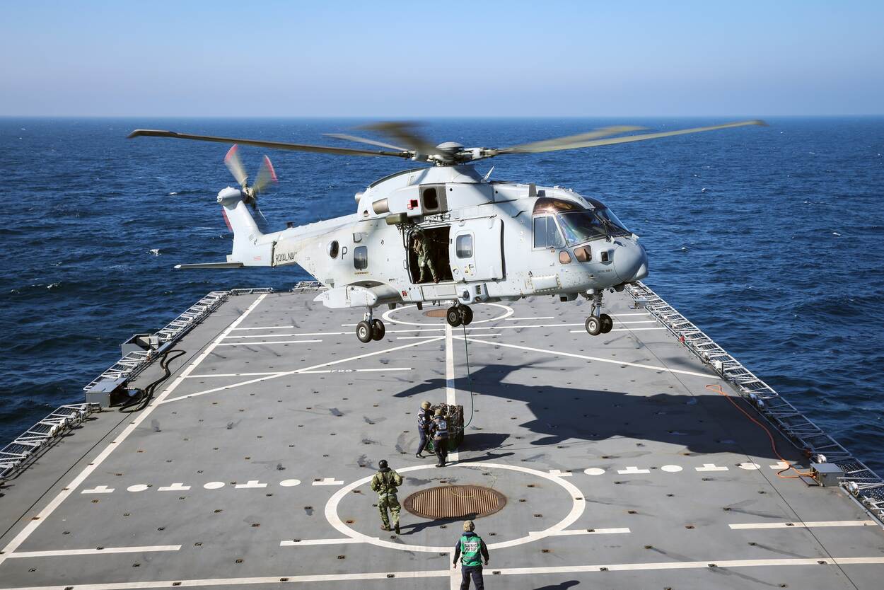 “Voordat de helikopters embarkeerden, oefenden we met 42 Commando op het gebied van boardings, waarbij de Britten bij ons aan boord klommen. 47 Commando – hun ‘bootgroep’ – voerde dokoperaties uit met landingsvaartuigen. Daarna staken we over naar het Franse Brest. Hier embarkeerden 2 Merlins en 30 man aan vliegers, vliegers-in-opleiding, instructeurs en technische en logistieke ondersteuning, nog aangevuld met een aantal klassen technisch en ondersteunend personeel.”