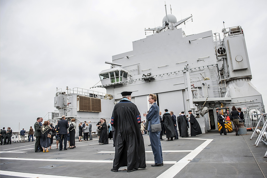 Toga’s aan dek van Zr.Ms. Johan de Witt? Je kunt wel een praktischer tenue bedenken aan boord van een marineschip. Maar voor de opening van het academisch jaar van de Nederlandse Defensie Academie was de locatie gisteren juist heel toepasselijk. “Wij leiden op voor slechts 1 werkgever: de krijgsmacht", vertelt de commandant NLDA, generaal-majoor Theo Vleugels. Alles dat we doen, is in de context van de taken van Defensie. En hoe kunnen we dat signaal nou beter afgeven dan op deze plaats?” Een nadere kennismaking met hét opleidingsinstituut van Defensie.