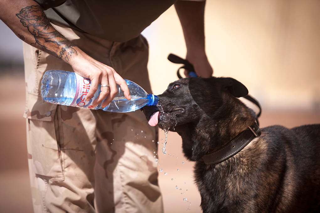 In een woestijnland als Mali is drinken een sleutelwoord. Ook voor de honden van de Force Protection. Anne: “We verzorgen de honden heel goed. Goed eten, veel en niet te koud drinken. Het blijft pittig voor ze, maar ze zijn fit dus kunnen het aan.”