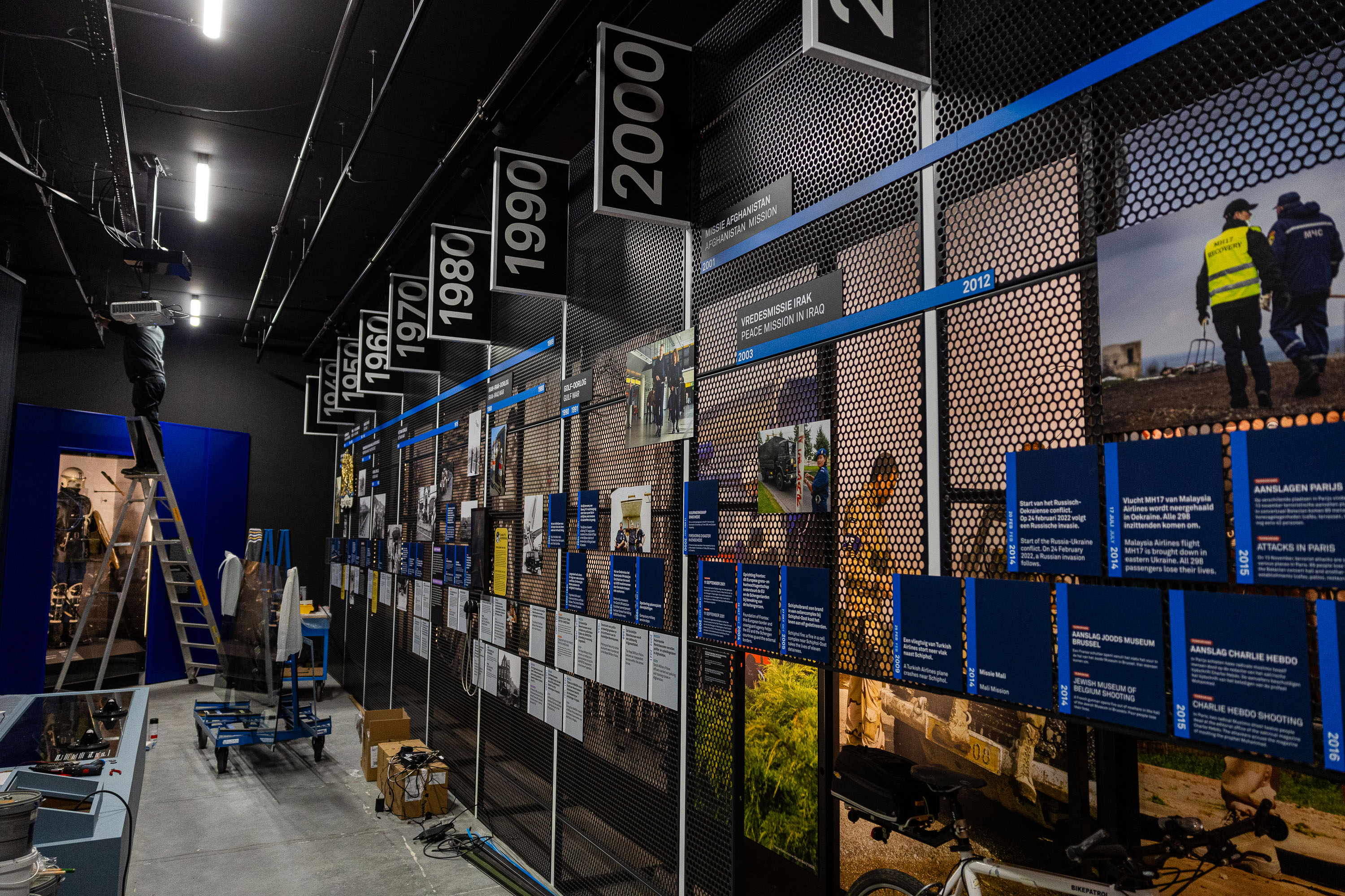 De belangrijkste gebeurtenissen uit de geschiedenis van de marechaussee zijn te zien op een grote tijdlijn die een hele wand in beslag neemt. Aan de hand van foto’s, maar ook objecten wordt de bezoeker meegenomen in de geschiedenis en de ontwikkeling van de marechaussee. Zo is de fiets te zien van de marechausseecollega die nog net op tijd weg kon duiken tijdens de aanslag op De Naald in Apeldoorn tijdens Koninginnedag 2009. Aan het eind van de tijdlijn prijkt het jaar 2030, de toekomst dus. “We hebben bewust een stukje opengelaten, omdat de marechaussee altijd door blijft ontwikkelen.”