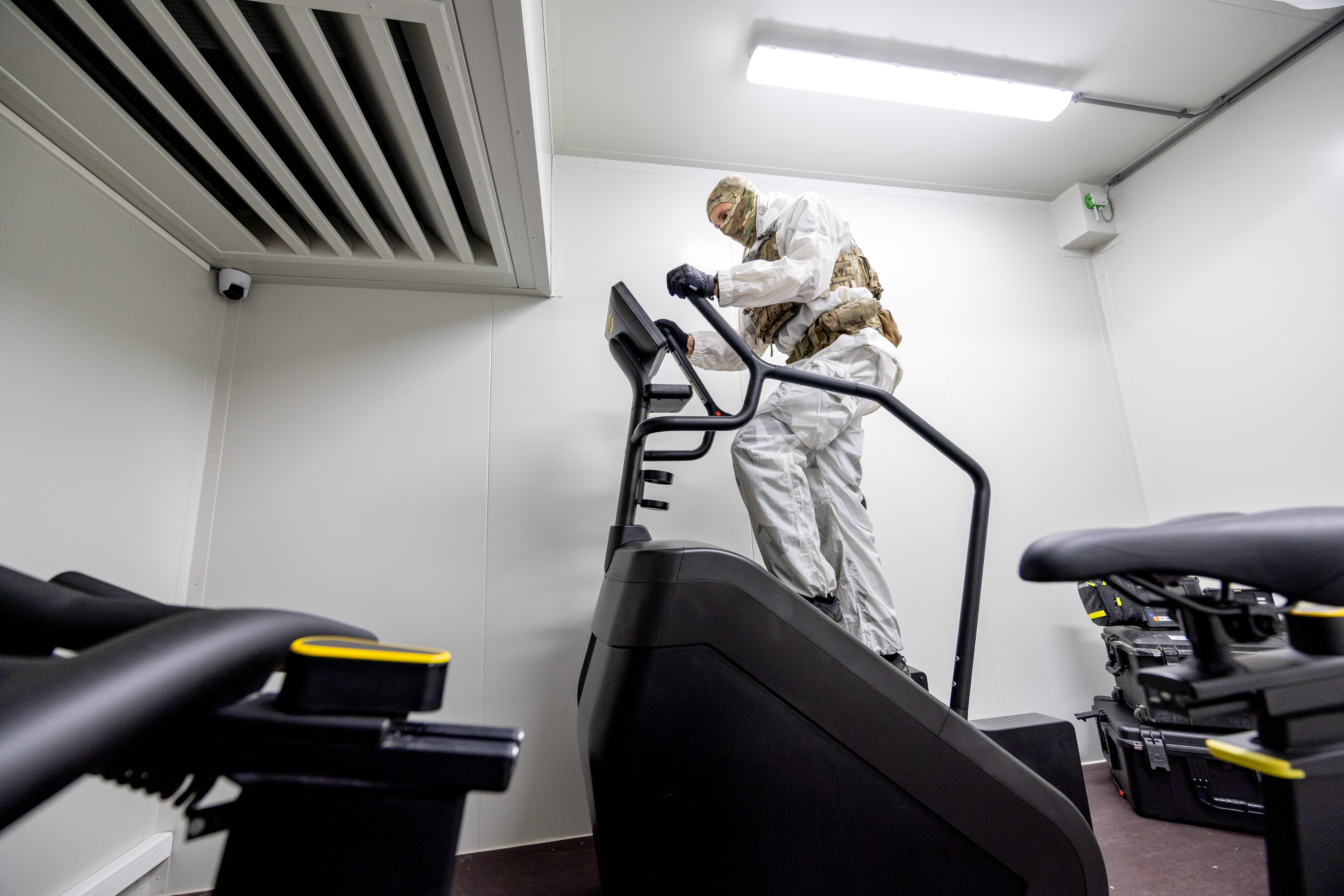 In de ruimte, die lijkt op een grote koelcel, zijn temperatuur, luchtvochtigheid en zuurstofgehalte handmatig in te stellen. Los van elkaar, maar ook in alle mogelijke samenstellingen. Vooral dat laatste maakt het een unieke plek, vertelt inspanningsfysioloog Gerard. De doctor is nauw betrokken bij het project. “Binnen de NAVO zijn we de enige eenheid die zelf zoiets heeft.”