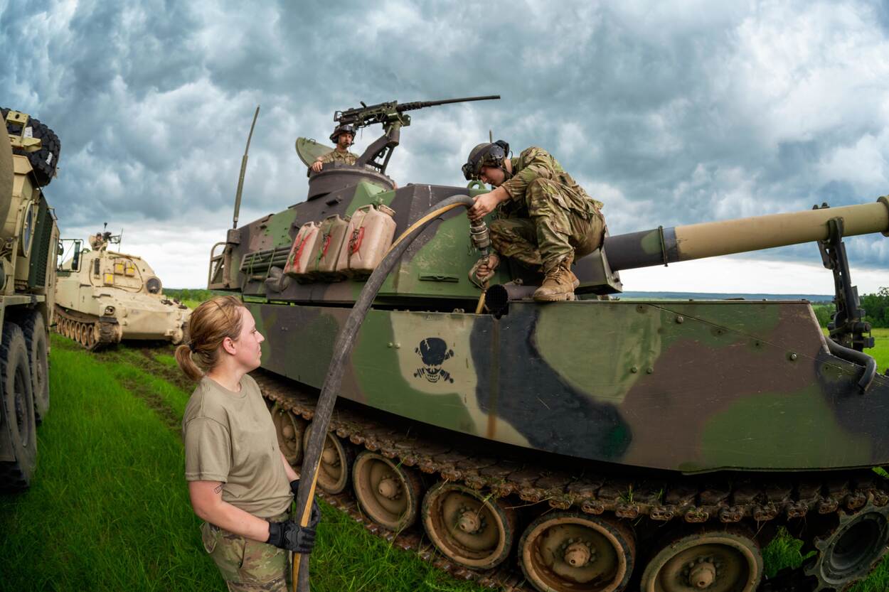Amerikaanse reservisten tanken voertuigen bij op Fort Chaffee, in de staat Arkansas. De militairen van Charlie Battery National Guard in die staat (2e Bataljon, 142 BrigadeVeldartillerie) zien M109A6 Paladin-houwitsers en de M992A2 munitie-ondersteuningsvoertuigen van de veldartillerie voorbij komen tijdens hun jaarlijkse schietoefening.