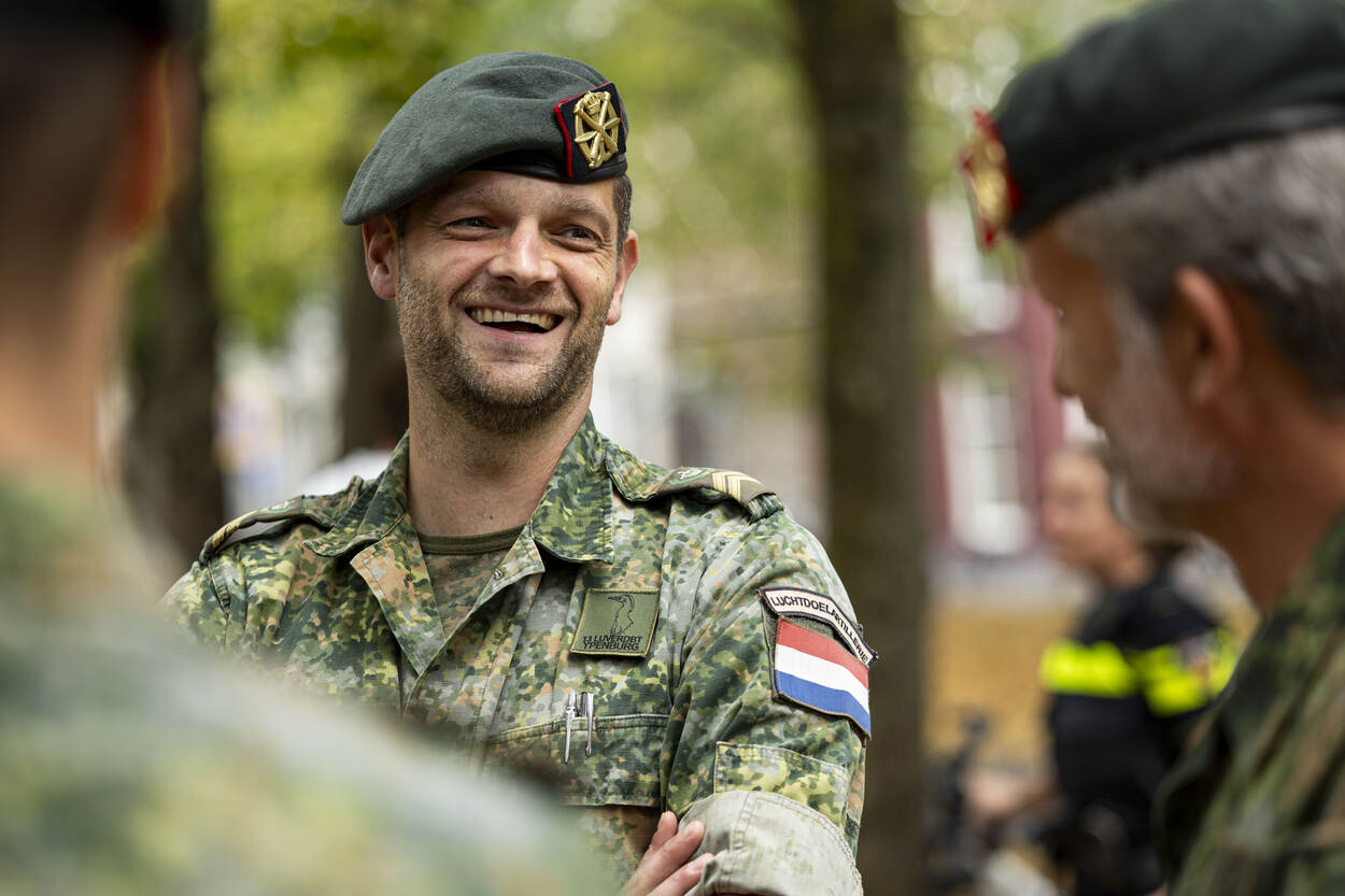 Terug naar het Lange Voorhout, waar de voorbijgangers de rondlopende militairen uitgebreid in zich opnemen. Een dame verderop is druk met een fotoshoot en laat zich niet afleiden. Ook niet door deze invasie van groene en blauwe pakken. In de boom waarvoor het detachement van Stan en Youri straks komt te staan, zit nog een groene punaise. Een overblijfsel van vorig jaar. Het maakt de locatie snel vindbaar.