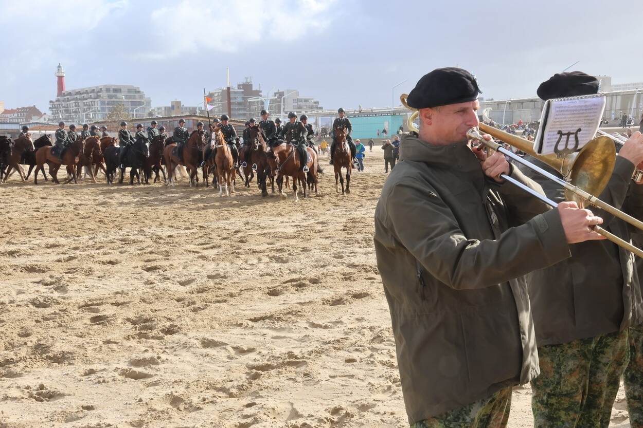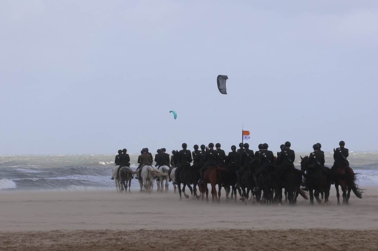Naast de ruiters trad ook de Fanfare ‘Bereden Wapens’ op. “Om de paarden (en het publiek) te laten wennen aan geluiden, in dit geval muziek”, aldus Dennis. “Zowel het CEE als het FBW zijn overigens onderdeel van het Regiment Huzaren Prinses Catharina-Amalia.” Op foto twee zien we de paarden het strand verlaten, terwijl het zand opstuift. “Er was die dag enorm veel wind”, verduidelijkt Dennis voor de zekerheid.