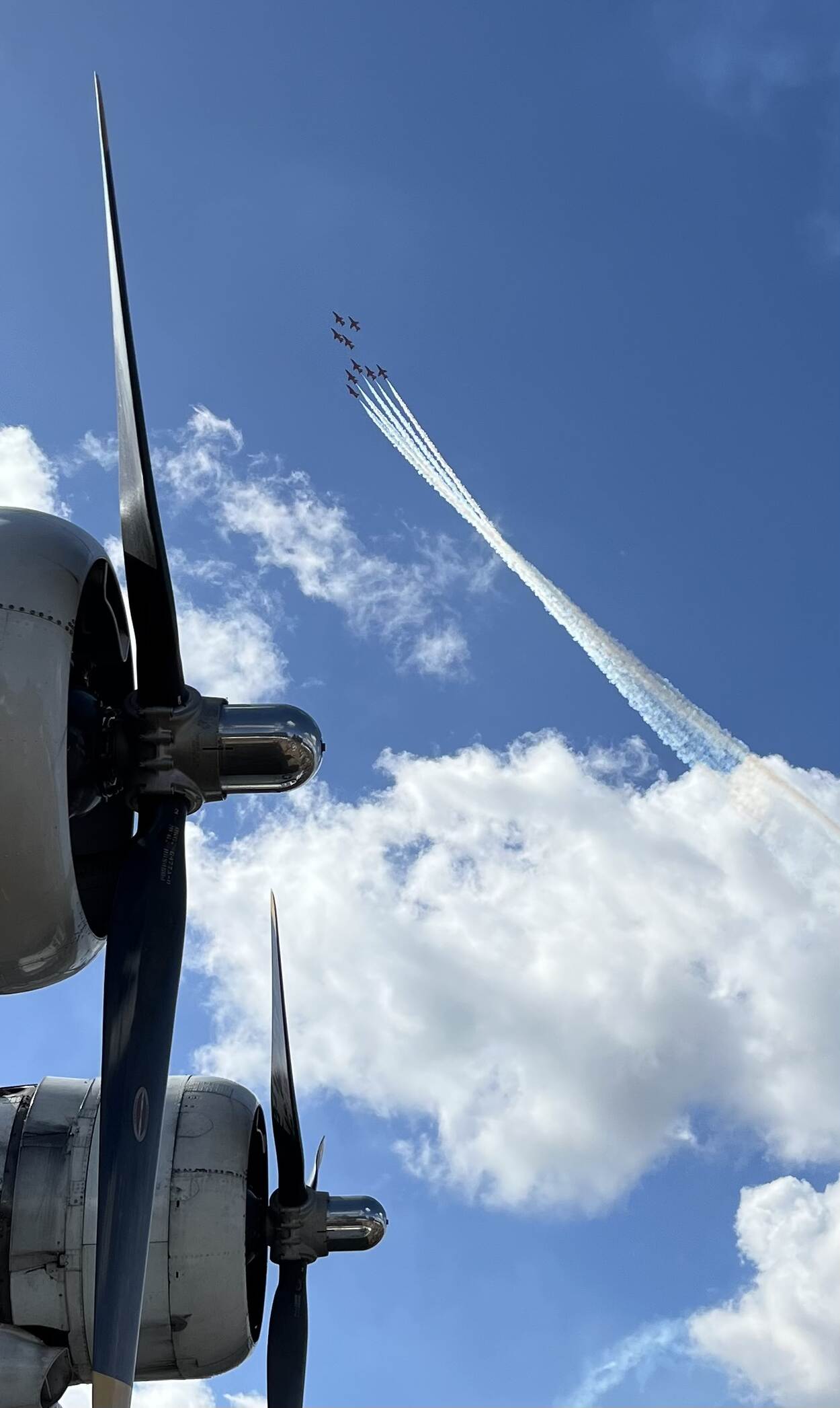Een foto vanuit ons buurland. Chris Sluijters bezocht in het Belgische Hechtel een vliegshow van de Red Arrows, een demonstratieteam van de Britse Royal Air Force. Behalve de negen rode toestellen, zien we ook de propellers van een Catalina-vliegboot. Stijlvol beeld. En dat gewoon met de telefoon gemaakt, voegt Chris er aan toe.