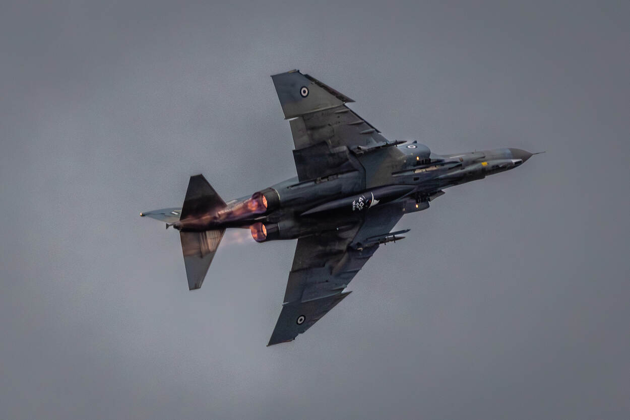 De camera van Martin draaide overuren. Een van zijn beste shots heeft hij naar ons gestuurd. “Deze Griekse Phantom! Soort van nostalgie. Ik begon de fotocarrière met dit type op Soesterberg. En vijftig jaar later voelde het toch een beetje als laatste kans er nog eentje vliegend te zien.”