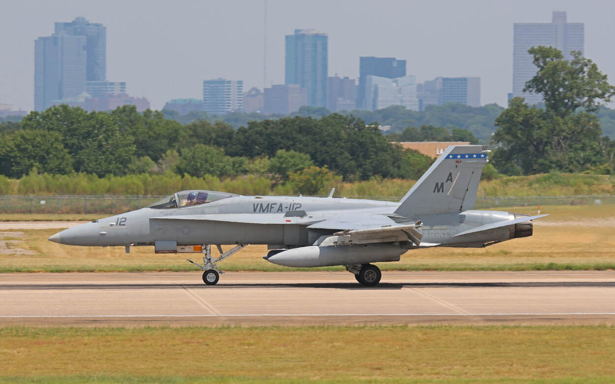 Wel in beeld: Legacy Hornets (rechts) van de VMFA-112 'Cowboys'. “Waarschijnlijk de laatste USMC (United States Marine Corps, red.) unit die overgaat op de F-35”, weet Coert. En ook: een T-45C Goshawk (links). Coert zag er onderweg verschillende, zoals deze op Corpus Christi International Airport. Geen slechte vangst voor drie weken toeren.