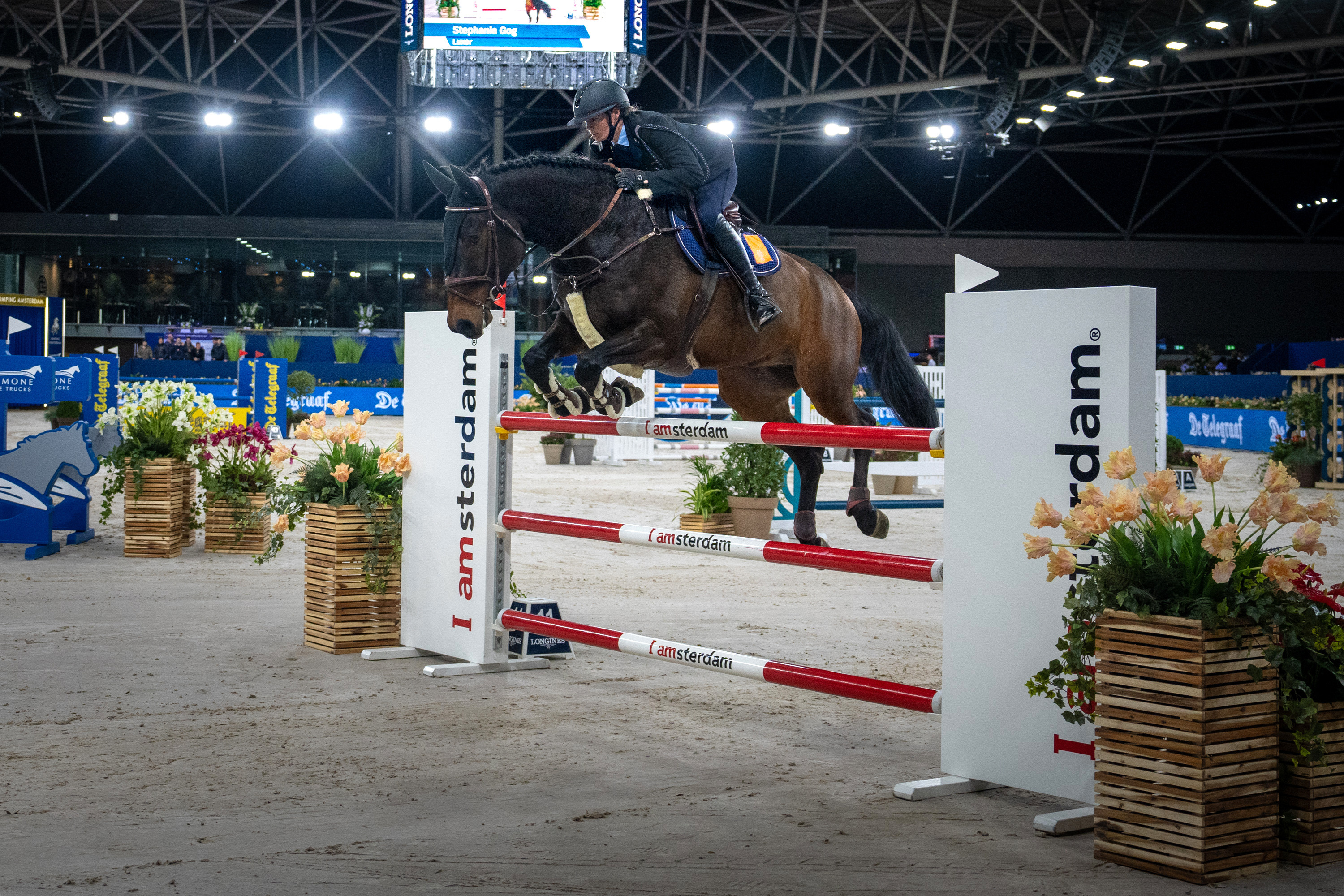 Opperwachtmeester Stephanie (35) en Luxor kwamen uit op het hoogste niveau in de landelijke wedstrijdcategorieën, ‘rubrieken’ in de paardensport. Samen legden zij een parcours af met hindernissen van 1.35 meter hoog. Dit is een klasse net onder de professionele rubrieken, waar hindernissen tussen de 1.40 en 1.60 meter hoog zijn. “Het publiek reageerde goed op de aanwezigheid van collega’s in uniform”, zegt majoor Arthur, teammanager van het nationale militaire team en commandant van de Bereden Brigade Koninklijke Marechaussee. “Er waren zelfs enkele mensen die zich bij Defensie willen aanmelden om deel uit te maken van de Bereden Brigade. Dus deelname is mooie reclame.” Stephanie moest tijdens Jumping Amsterdam als eerste aan de bak met de 9-jarige Luxor. “Ik had gezonde spanning. Niet alleen omdat er veel collega’s kwamen kijken, maar ook omdat het de eerste keer was voor Luxor dat hij in de Amsterdam RAI moest presteren.” De eerste ronde verliep foutloos. Tijdens de zogeheten barrage, waarbij snelheid belangrijk is, maakte het koppel slechts 2 fouten. Desondanks vielen ze helaas net buiten de prijzen. “Toch ben ik enorm trots. We hebben een supermooi rondje gereden”, aldus Stephanie, die in het dagelijks leven werkt op Bureau Ceremonieel in Den Haag. Het militair team bestond uit 1 ruiter van de Marechaussee en 3 cavaleristen van de landmacht. Deze teamgenoten kwamen uit in de rubrieken 1.30, 1.20 en 1.10 meter. Jumping Amsterdam is een groot hippisch evenement waar de focus ligt op springwedstrijden. Verdeeld over 4 dagen zien zo’n 55.000 toeschouwers hoe de ruiters en paarden proberen zo foutloos en snel mogelijk het parcours af te leggen. “Deze discipline stamt uit de militaire traditie. Daarom was het mooi om ook daar een team aanwezig te hebben”, aldus Arthur. “Ze hebben het fantastisch gedaan.” Ruiter en paard moeten nauw samenwerken om een mooie prestatie neer te zetten. De hindernissen waren hoog en de looplijnen technisch, blikt Stephanie terug. “Dus ik moest mijn focus vasthouden. Ik wilde een goed rondje neerzetten, zeker omdat er veel support aanwezig was.” Van tevoren maakte ze een rijplan voor de juiste looplijn. Ze telde de galoppassen om te weten hoeveel sprongen ze tussen de hindernissen moest maken. “Als dat niet helemaal lukt, moeten het paard en ik tussendoor het ritme herstellen om bij de volgende hindernis alsnog goed uit te komen. Het plan is gelukt. Ik heb voor mijzelf in het basisparcours een perfect rondje neergezet. Beter had niet gekund.” Succes tijdens een springwedstrijd ligt voor zo’n 75 procent bij een goed paard dat kan én (hoog) wil springen, weet Arthur. En dan moet de combinatie van ruiter en paard ook nog tijdens een indrukwekkende ambiance als Jumping Amsterdam presteren. “Wanneer een paard daar niet aan gewend is, kan dat zorgen voor een slechtere prestatie. Maar een talentvolle ruiter kan dat bijsturen. Uiteraard op zo’n manier dat het veilig is voor mens én dier. Dat staat voorop.” Het militaire team is onderdeel van het Bureau Internationale Militaire Sport (BIMS). Talentvolle militairen kunnen dankzij BIMS onder werktijd trainen en wedstrijden rijden. “Komend jaar hebben we nog diverse trainingen en wedstrijden op het programma staan”, vertelt Arthur. “Meedoen is belangrijker dan winnen. Het idee achter BIMS is om een goede werkgever te zijn. We willen zoveel mogelijk collega’s de kans geven om op een gepast niveau met hun sport bezig te zijn.”