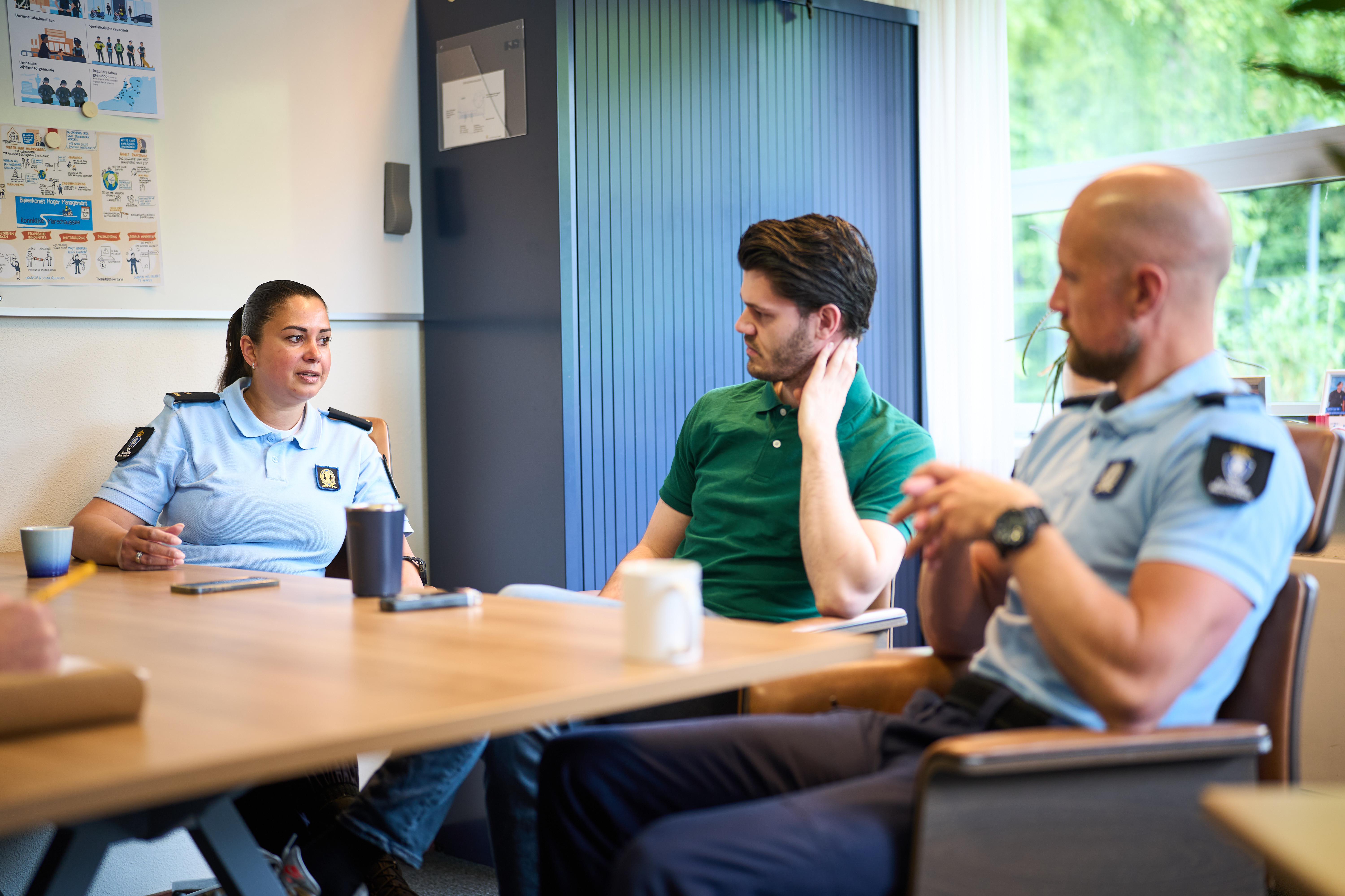 Onder anderen Tobias van Directie Human Resources en Bedrijfsvoering (HR&BV), majoor Indra en kapitein Roel denken hier over na. De 2 laatstgenoemden zijn respectievelijk de commandant en plaatsvervangend commandant van de Brigade Objectbeveiliging (BOB).