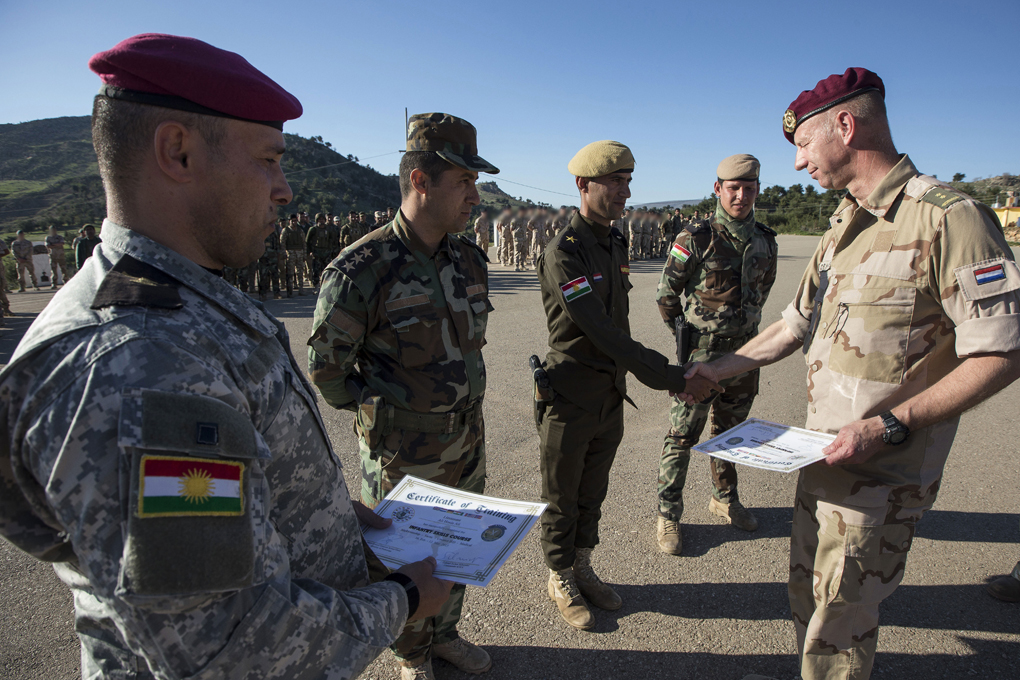 Ruim 130 militairen verblijven momenteel in Irak voor het opleiden van de Peshmerga en de Iraakse strijdkrachten. Inmiddels hebben 8 Koerdische pelotons de infanterietraining succesvol afgerond. De helft hiervan is opgeleid door Nederlandse instructeurs. Volgens luitenant-kolonel Harm van der Have, Senior National Representative (SNR) in Irak, zijn de strijders dapper, maar missen zij essentiële kennis voor hedendaagse oorlogsvoering. “Dat gaat van het optreden in verstedelijkt gebied tot het onderkennen van geïmproviseerde explosieven (IED’s)”, vertelt Van der Have. “Op onze trainingscentra leren de cursisten hoe zij in de meest voorkomende oorlogssituaties moeten overleven.”