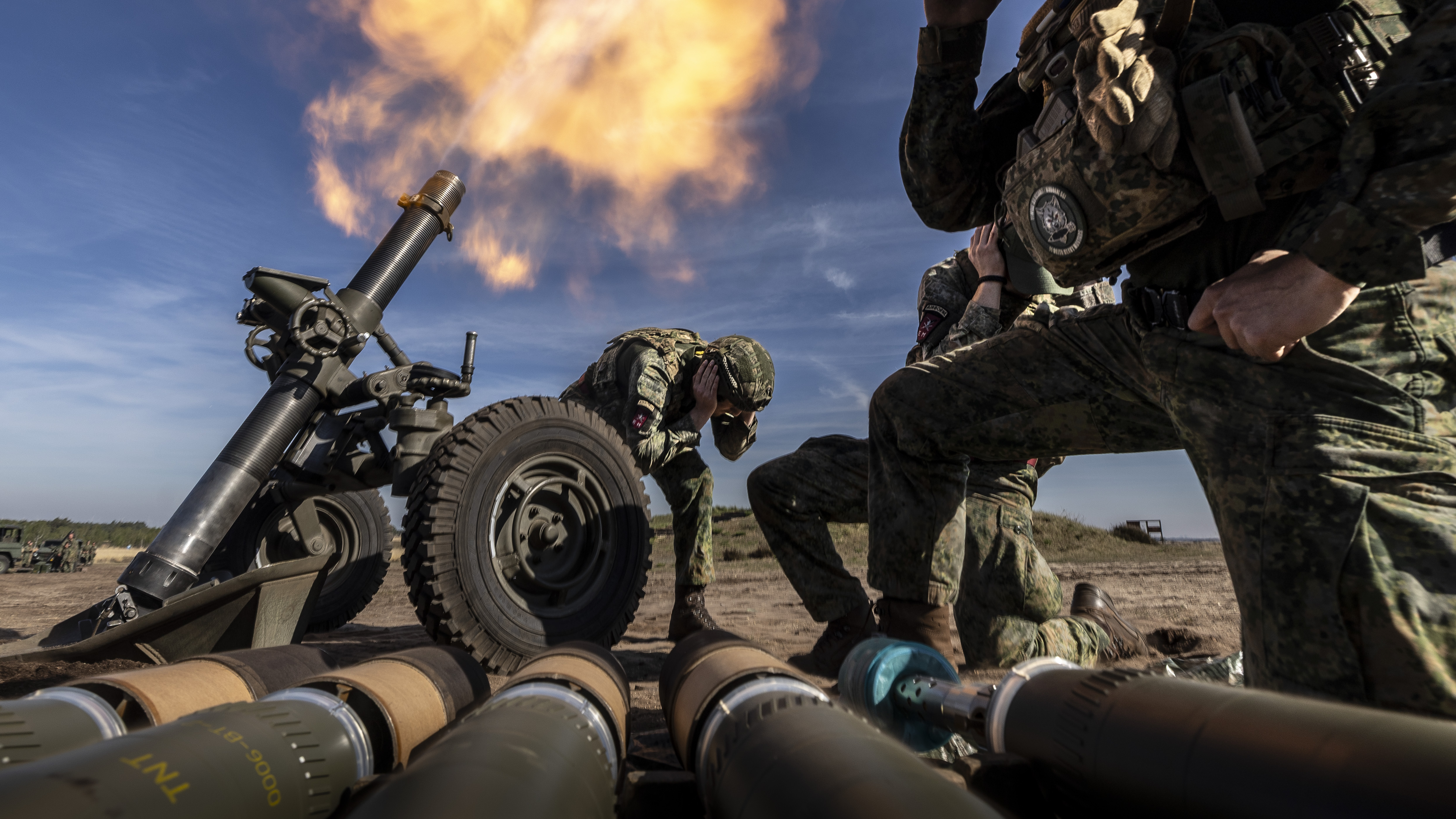 ‘Stuk 2, richting 0695, elevatie 1167!’, klinkt het luid vanuit het FDC. Een korporaal bij de betreffende mortier herhaalt de gegevens en collega’s draaien de standen op het stuk.