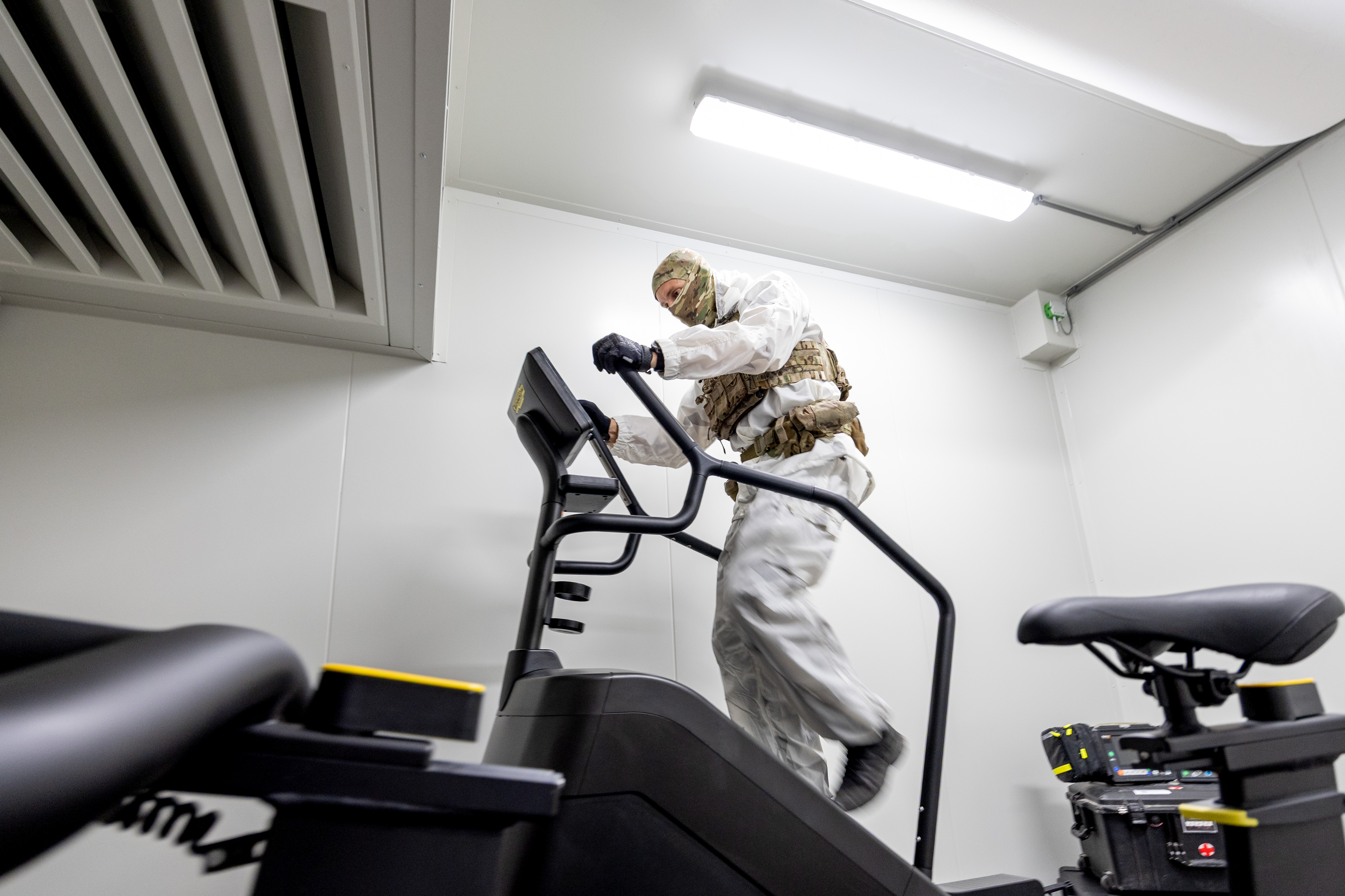 Niets zo veranderlijk als het weer. En zeker niet voor de militairen van het KCT, die wereldwijd ingezet worden. In alle klimaattypes. Daarom ontwikkelde de landmacht een klimaatkamer. In de ruimte, die lijkt op een grote koelcel, zijn temperatuur, luchtvochtigheid en zuurstofgehalte handmatig in te stellen. Los van elkaar, maar ook in alle mogelijke samenstellingen. Vooral dat laatste maakt het een unieke plek. “Onze partners hebben wel ruimtes waar zij afzonderlijke onderdelen kunnen ervaren, maar niet in verschillende combinaties. Binnen de NAVO zijn we de enige eenheid die zelf zoiets heeft”, vertelt een trotse Gerard. De doctor is als inspanningsfysioloog nauw betrokken bij het project.