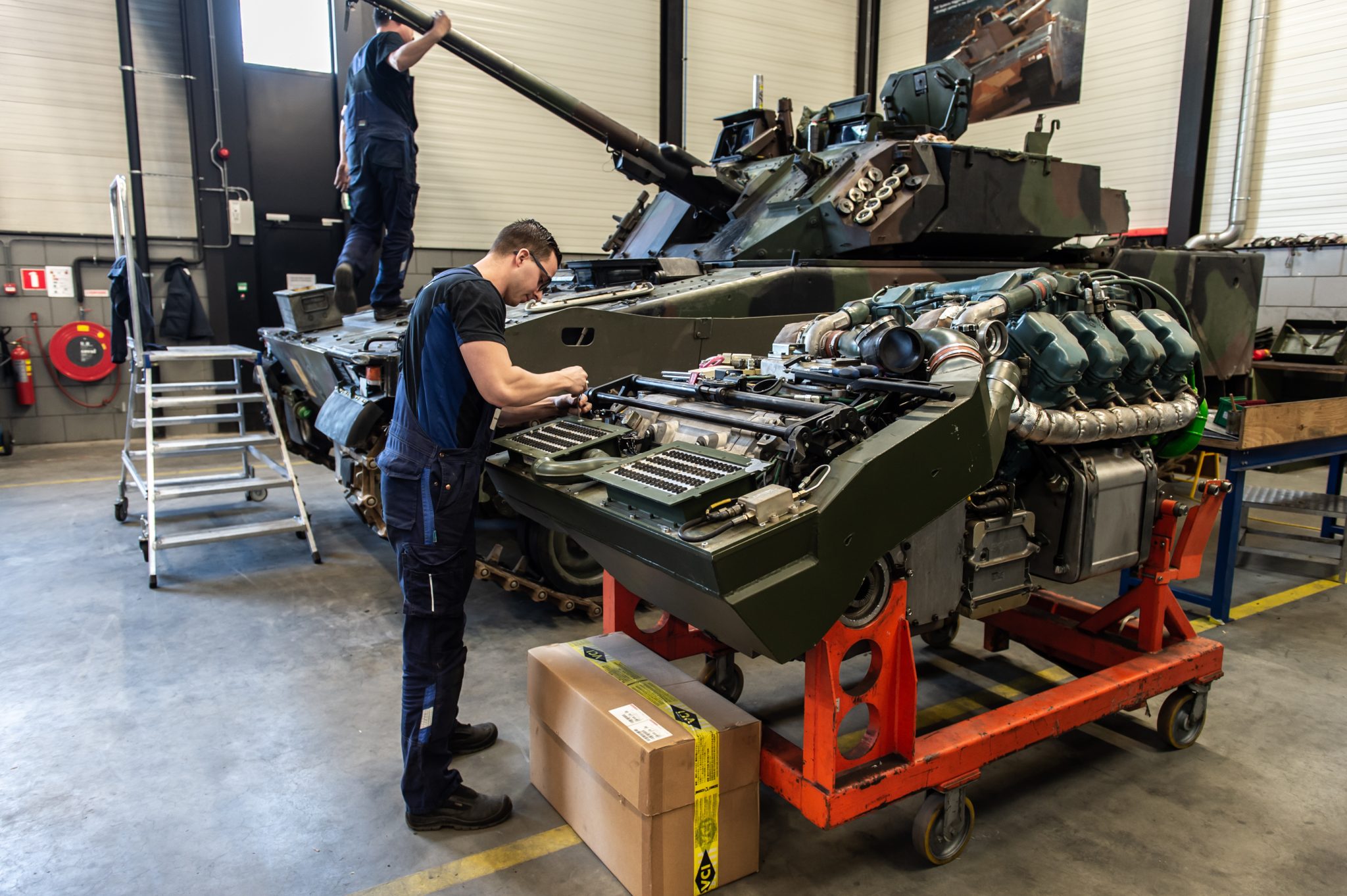Neem nou de CV90. Die is grotendeels in Nederland gebouwd. Momenteel werken we – in samenwerking met de buitenlandse fabrikant – aan de upgrades van zowel de Fennek als de CV90. Op de tweede plaats verzorgen we de reparaties van bijvoorbeeld motoren en transmissies. Op voertuigniveau werken we vanuit Bunschoten, op componentenniveau doen we dat in Hattemerbroek. Daar onderhouden en repareren we systemen van onder meer Leopards, Pantserhouwitsers en Boxers. Ook produceren we onderdelen zoals airco’s en loopwielen. En zoom je nog verder in op de CV90, zie je dat we de toren daarvan volledig in onze eigen fabriek maken.”
