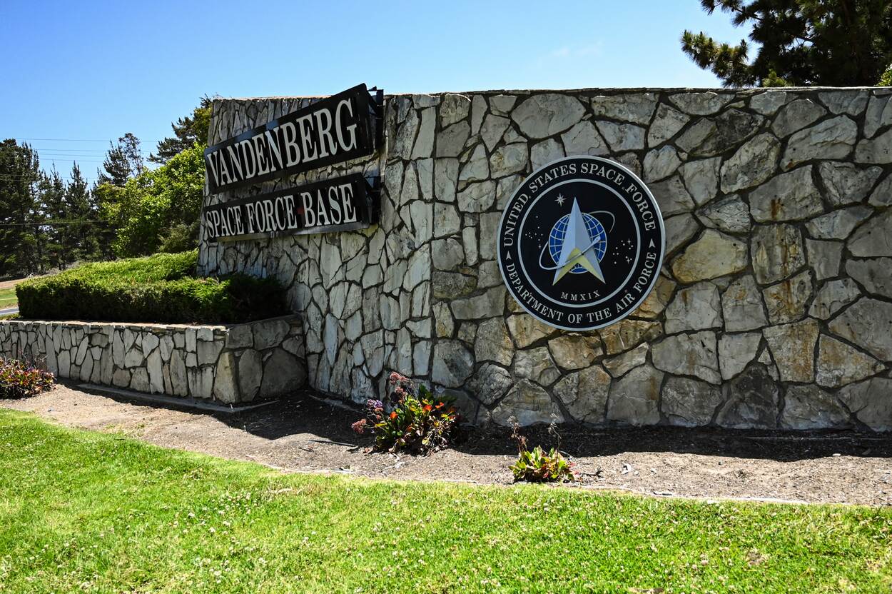 Een stenen muurtje met daarop de tekst Vandenberg Space Force Base, daarnaast het logo ervan.