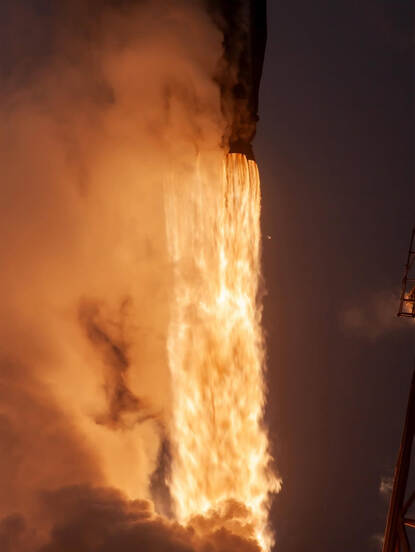 De raket wordt gelanceerd. Het vuur aan de onderkant toont dat deze met grote snelheid de lucht in schiet.