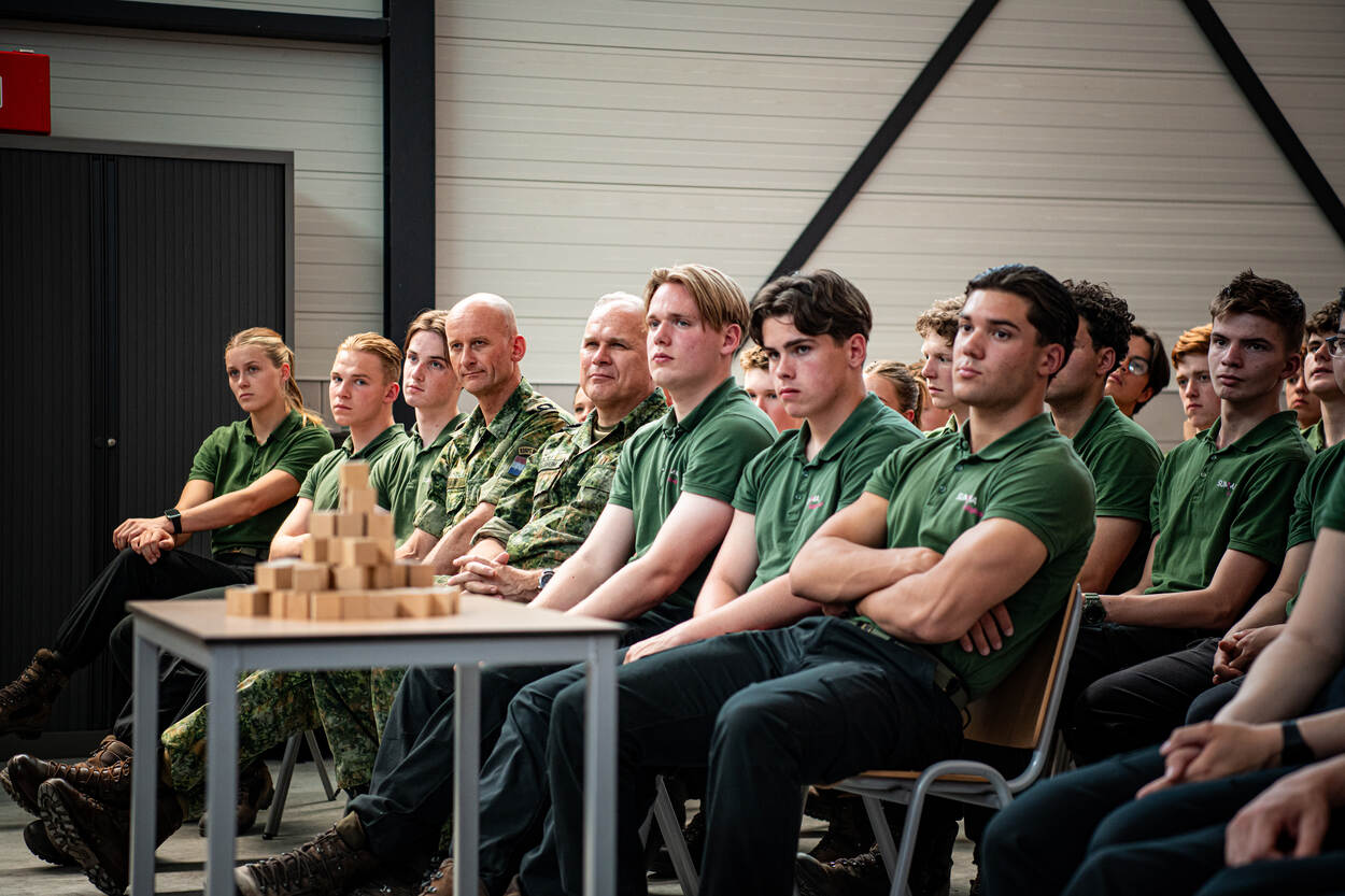 De aanwezige mbo-studenten marcheren de ruimte binnen en staan keurig in de houding. Daarna komen de Commandant der Strijdkrachten (CDS) en Krijgsmachtadjudant binnen. Nadat de CDS het commando ‘rust’ heeft gegeven, ontspant de zaal en gaat iedereen zitten. De presentatoren van De Kiesmannen, Dylan en Jochem, starten de les.