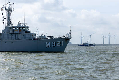 Ook de Standing Naval Mine Counter Measures Group 1 (SNMCMG1) deed mee, hier voor de kust van Zuid-Holland. Op de voorgrond de Canadese HMCS Yellowknife.