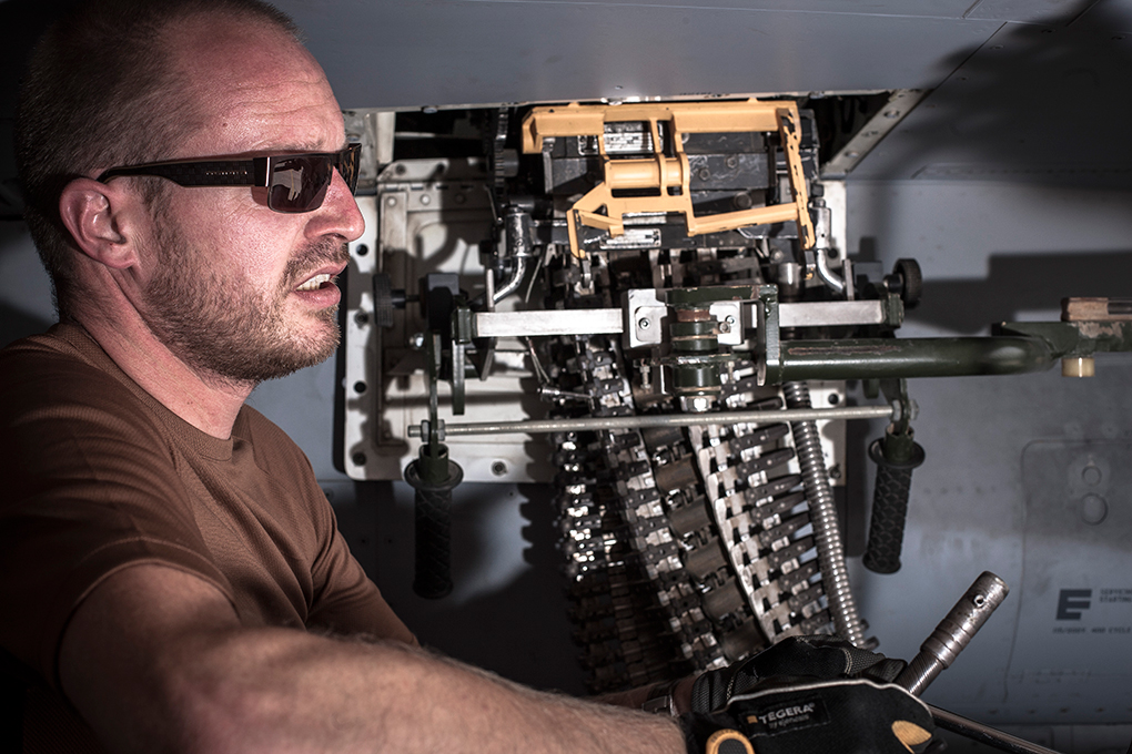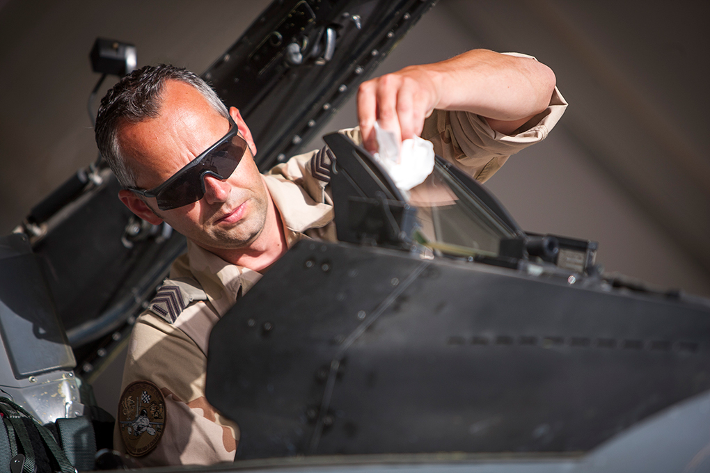 “Net als in Nederland bij het 322 Squadron op Leeuwarden ben ik bij de ATF crewchief. Ik ben verantwoordelijk voor de visuele inspecties aan de F-16’s. Dit doe ik samen met de vlieger voordat de vlucht begint. We werken aan de hand van een checklist. De werkzaamheden hier zijn gelijk aan die in Nederland. Alleen de omgeving is anders en de lijnen zijn hier wat korter. Je werkt samen in een kleine groep en regelt hier dus alles met elkaar. Ik besef heel goed dat ik een belangrijke verantwoordelijkheid heb en dat alles goed gecontroleerd moet zijn. Uiteindelijk stapt er een vlieger in de kist en wil ik dat die heelhuids terugkomt.”