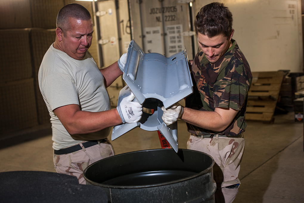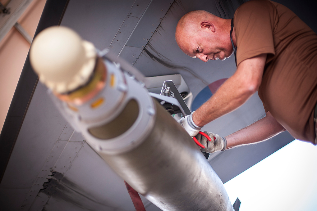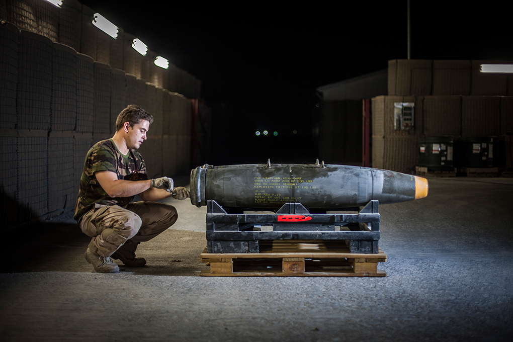 Wapentechnisch personeel maakt een JDAM gereed voor het ‘downloaden’.