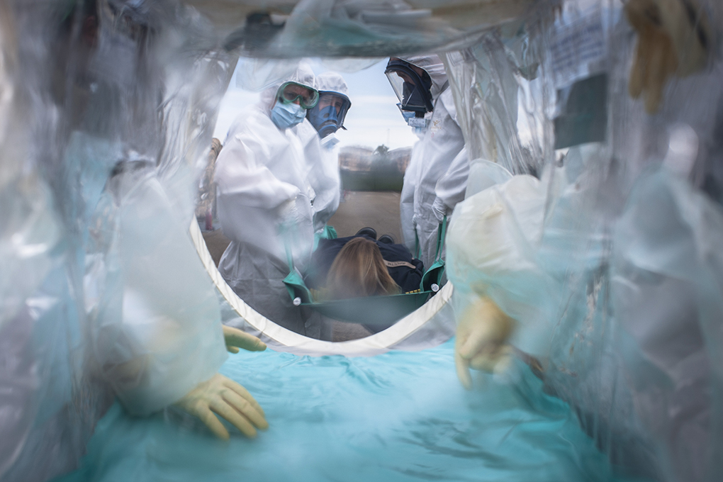Een brancard, daar draait het in de ‘ebola-cursus’ allemaal om. Of beter: de stretcher transport isolator (STI) en zijn iets grotere broer, de air transport isolator (ATI). Gedurende het vervoer vormen deze claustrofobische couveuses de leefwereld van de patiënt. Een door plastic begrensde biosfeer waar ziekmakende bacteriën of virussen niet uit kunnen. Mits het medisch personeel juist handelt.