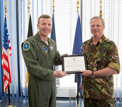 Luitenant-kolonel Ruud Snel ontving begin april de ‘Meritorious Service Medal’, uit handen van de Amerikaanse Commander AIRCOM, generaal Wolters. Snel ontving deze hoge Amerikaanse onderscheiding vanwege zijn uitzonderlijke verdiensten als liaison officier, verbonden aan de ‘Army Air Defence Artillery School’. De uitreiking vond plaats op het AIRCOM Hoofdkwartier op de Amerikaanse vliegbasis Ramstein in Duitsland. Foto: AIRCOM