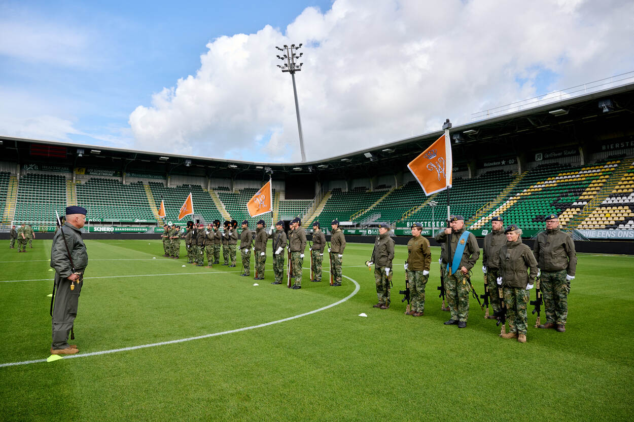 ‘Het vaandel is iets heiligs’, horen de aanwezigen tijdens de briefing in de supportersruimte. Over enkele minuten gaan de tientallen militairen het veld op met de vaandels van de verschillende krijgsmachtonderdelen. Strak in de pas en volgens vaste protocollen. Want, voordat het vaandel op Prinsjesdag met de troepen mee mag naar het centrum van de Hofstad, moet de vaandelwacht ‘intreden’. Een gebruik waarbij deze zevenkoppige groep aansluit bij de rest van de militairen. Vanaf dat moment valt de vaandelwacht onder bevel van de Commandant Erewacht. En precies dat stukje beoefenen de aanwezigen in het stadion.