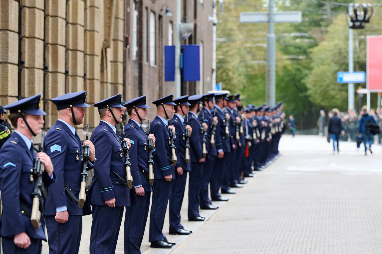 Tijdens deze generale repetitie geldt het ‘niet goed is opnieuw-principe’. Fouten maken kan nu nog, straks valt elk detail op. Zeker bij de vier vaandelwachten, die letterlijk boven de rest uitsteken. ‘Voorwaarts, mars’, schalt even later door de catacomben. Ongeveer twintig minuten na afloop van de briefing verschijnen de eerste personen op de natgeregende grasmat. Trots lopen de luchtmachters tussen de drie andere vaandelwachten: het Vaandel Korps Mariniers (de Erewacht bij de Koninklijke Stadsschouwburg), het Vaandel Garderegiment Fuseliers Prinses Irene (Ere-afzetting bij de Koninklijke Stadsschouwburg) en het Vaandel Garderegiment Grenadiers en Jagers (loopt mee met de Koninklijke Stoet).