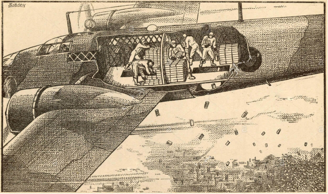 Tijdens een bombardementsvlucht gooit de bemanning van enkele Britse bommenwerpers, in eerste instantie de pamfletten door een lichtkogelschacht of een luik in de bodem van het vliegtuig naar buiten. Handwerk dus en heel primitief. Later worden Britse bommenwerpers en eenheden speciaal voor deze taak uitgerust. Vanaf augustus 1943 nemen de Amerikanen de verspreidingstaak van DVH over. De ondertitel luidt vanaf dan: ‘Verspreid door de geallieerde luchtmacht op weg naar Duitschland’.